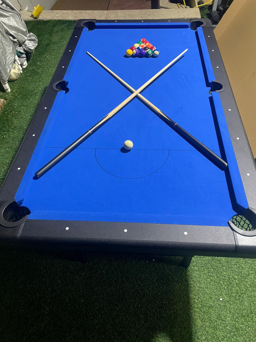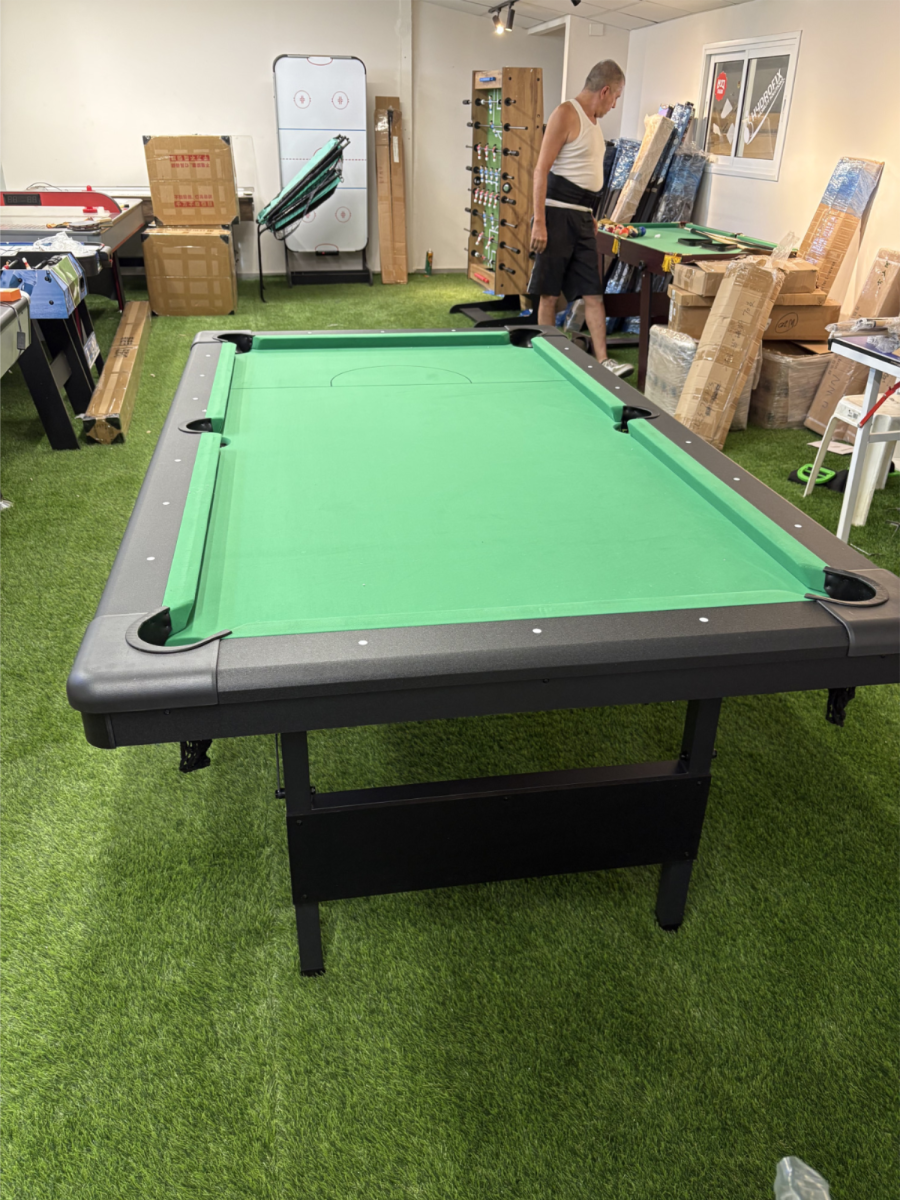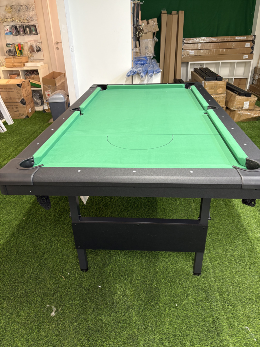 השולחן הטוב ביותר בשוק עם סימונים על הלוח וגימור מט בצדדים שולחן סנוקר מתקפל 7 פיט במידות של 212*122*81 סמ כולל סט אביזרים